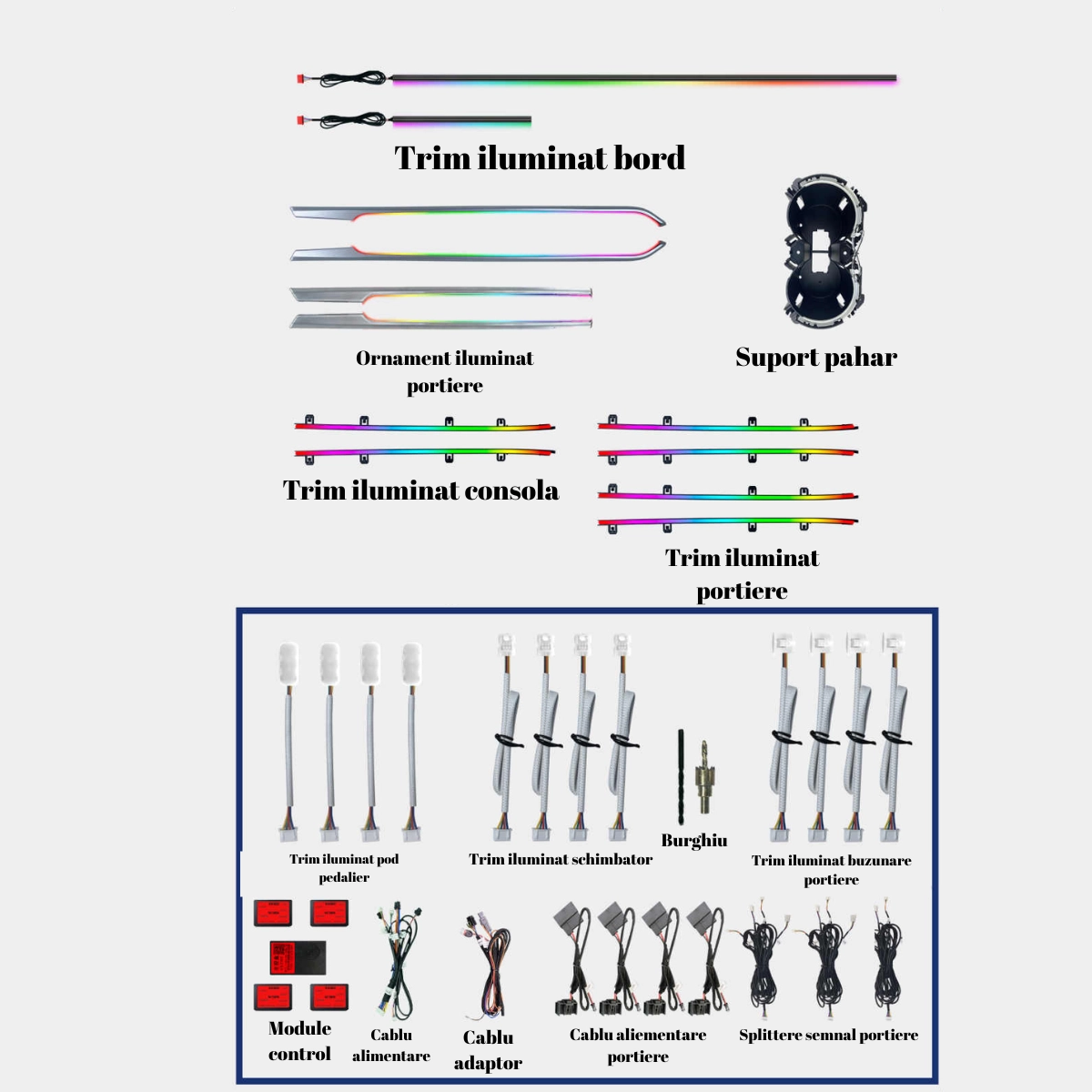 Kitul LED RGB pentru iluminare ambientala auto include 26 piese: 1 controler principal si 4 secundare wireless. Benzile acrilice ofera lumina continua, fara întreruperi. Alimentare 12V, control Bluetooth prin aplicatie mobila. Dispune de moduri multiple de iluminare si compatibilitate universala pentru o instalare simpla si eficienta.