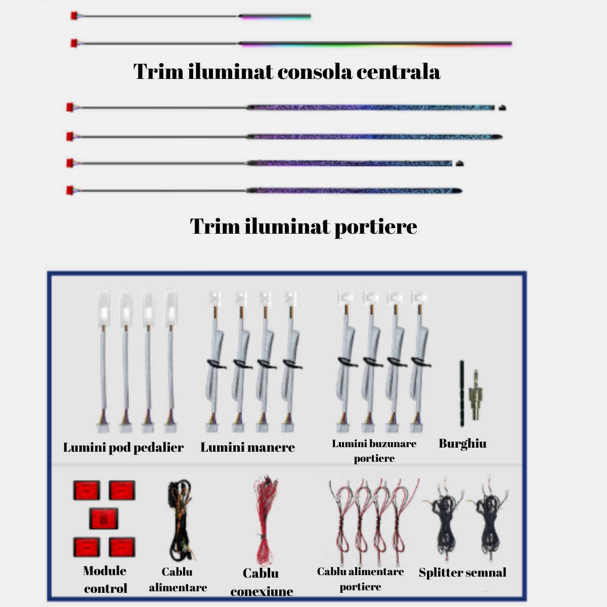 Kitul LED RGB pentru iluminare ambientala auto include 18 piese: 1 controler principal si 4 secundare wireless. Benzile acrilice ofera lumina continua, fara întreruperi. Alimentare 12V, control Bluetooth prin aplicatie mobila. Dispune de moduri multiple de iluminare si compatibilitate universala pentru o instalare simpla si eficienta.