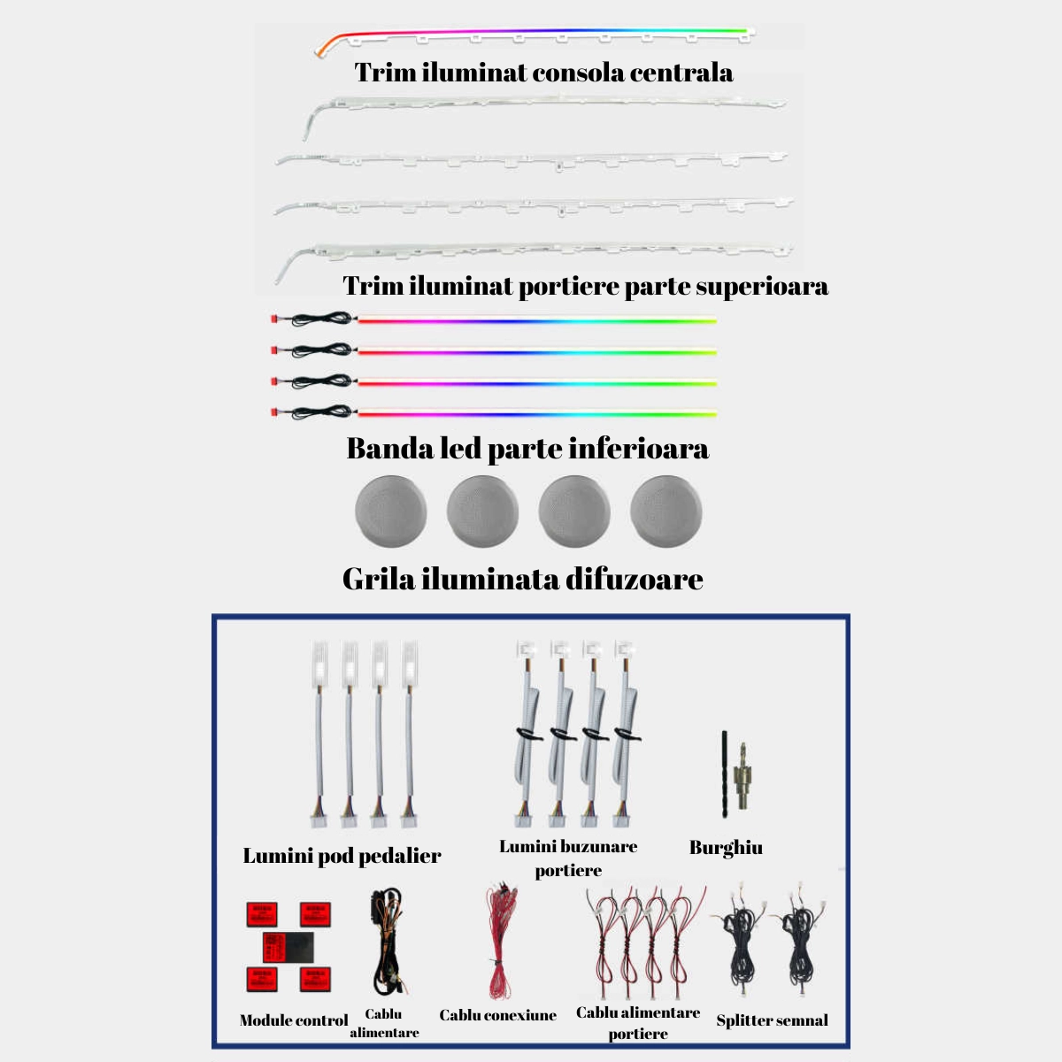 Kitul LED RGB pentru iluminare ambientala auto include 21 piese: 1 controler principal si 4 secundare wireless. Benzile acrilice ofera lumina continua, fara întreruperi. Alimentare 12V, control Bluetooth prin aplicatie mobila. Dispune de moduri multiple de iluminare si compatibilitate universala pentru o instalare simpla si eficienta.