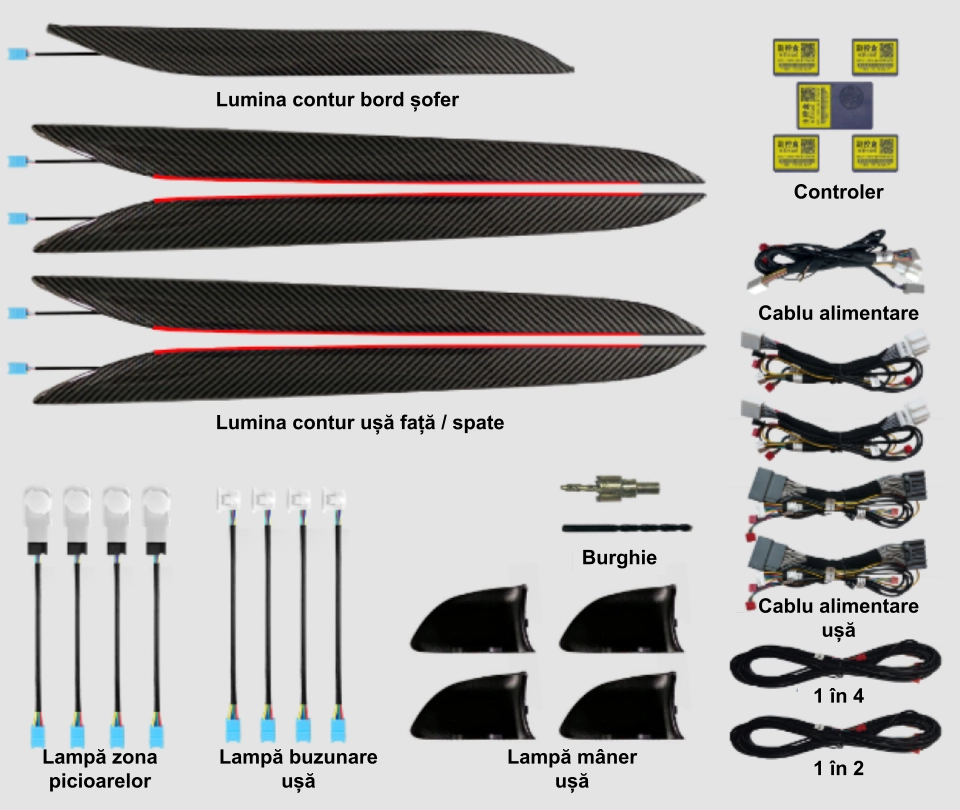 Kitul LED RGB pentru iluminare ambientala auto include 17 piese: 1 controler principal si 4 secundare wireless. Benzile acrilice ofera lumina continua, fara întreruperi. Alimentare 12V, control Bluetooth prin aplicatie mobila. Dispune de moduri multiple de iluminare si compatibilitate universala pentru o instalare simpla si eficienta.