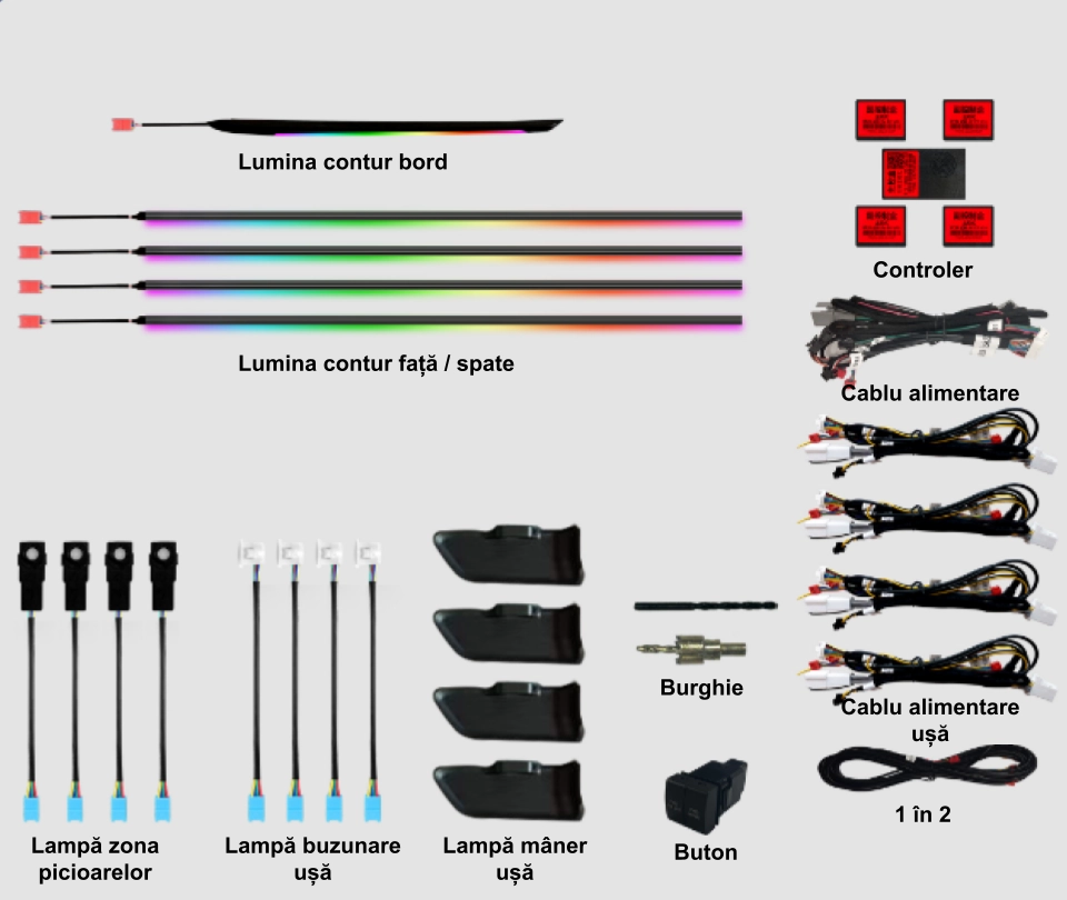 Kitul LED RGB pentru iluminare ambientala auto include 16 piese: 1 controler principal si 4 secundare wireless. Benzile acrilice ofera lumina continua, fara întreruperi. Alimentare 12V, control Bluetooth prin aplicatie mobila. Dispune de moduri multiple de iluminare si compatibilitate universala pentru o instalare simpla si eficienta.