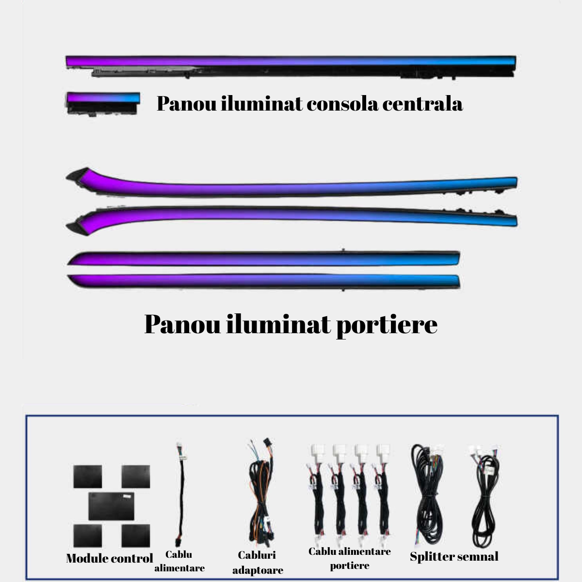 Kitul LED RGB pentru iluminare ambientala auto include 12 piese: 1 controler principal si 4 secundare wireless. Benzile acrilice ofera lumina continua, fara întreruperi. Alimentare 12V, control Bluetooth prin aplicatie mobila. Dispune de moduri multiple de iluminare si compatibilitate universala pentru o instalare simpla si eficienta.