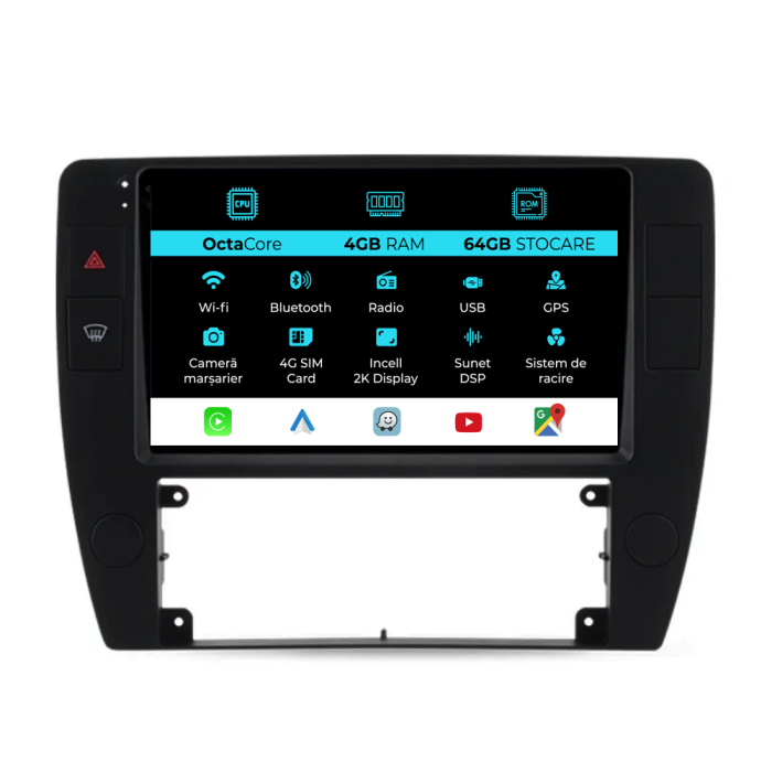 | Conectivitate rețea: | 4G, Hotspot telefon, router extern, dongle 3G sau 4G, CarPlay/Android Auto |