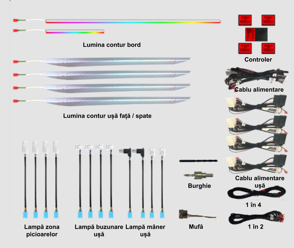 Kitul LED RGB pentru iluminare ambientala auto include 18 piese: 1 controler principal si 4 secundare wireless. Benzile acrilice ofera lumina continua, fara întreruperi. Alimentare 12V, control Bluetooth prin aplicatie mobila. Dispune de moduri multiple de iluminare si compatibilitate universala pentru o instalare simpla si eficienta.