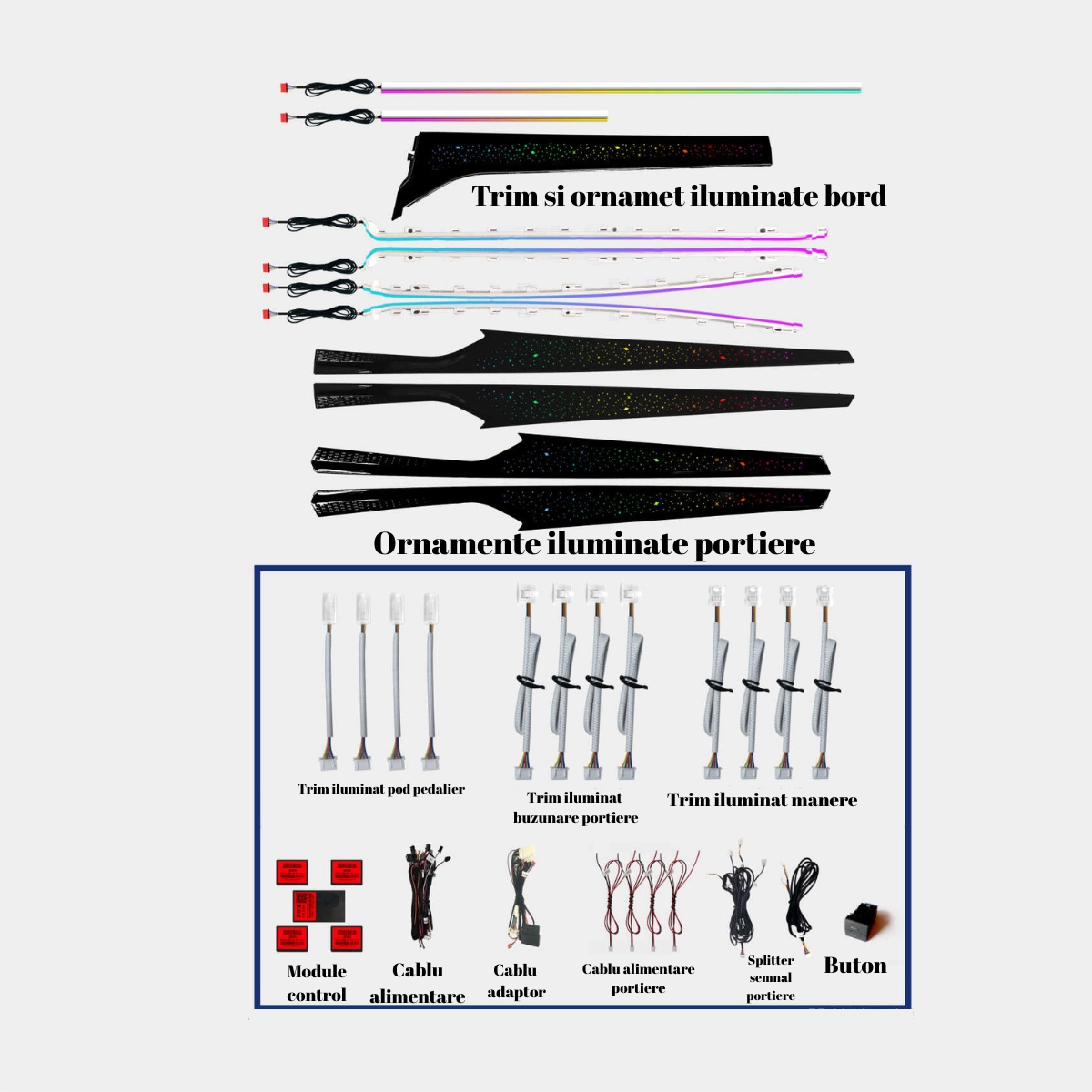 Kitul LED RGB pentru iluminare ambientala auto include 23 piese: 1 controler principal si 4 secundare wireless. Benzile acrilice ofera lumina continua, fara întreruperi. Alimentare 12V, control Bluetooth prin aplicatie mobila. Dispune de moduri multiple de iluminare si compatibilitate universala pentru o instalare simpla si eficienta.